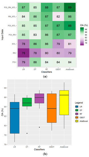 Among the 35 combinations between the five classifiers and seven types of input data, OA ranged from 76 to 89% (Figure 8). Overall, the largest OA was obtained using the POI_RN_NTL data and AdaBoost, while the smallest OA was obtained using RN data and LR. Most of the combinations of two or three types of data achieved a higher OA than single-input data.