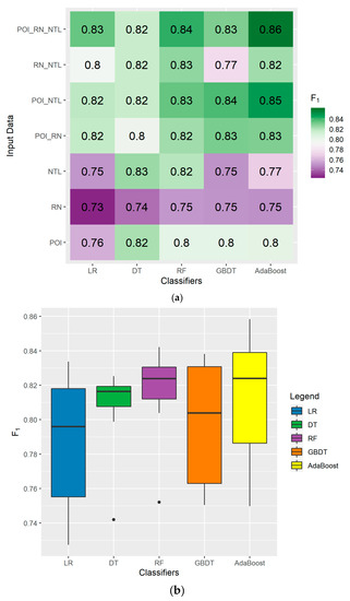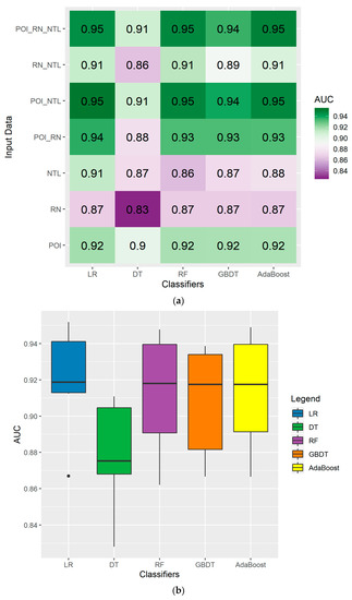 The results show that, among the 35 combinations between the five classifiers and seven types of input data, the best classification performance was achieved using POI_RN_NTL as input data and AdaBoost as the classifier. Moreover, a lower variance was achieved using the combinations of two or three types of data. More robust classification results were obtained using ensemble methods of RF, GBDT, and AdaBoost compared to the traditional methods of LR and DT.