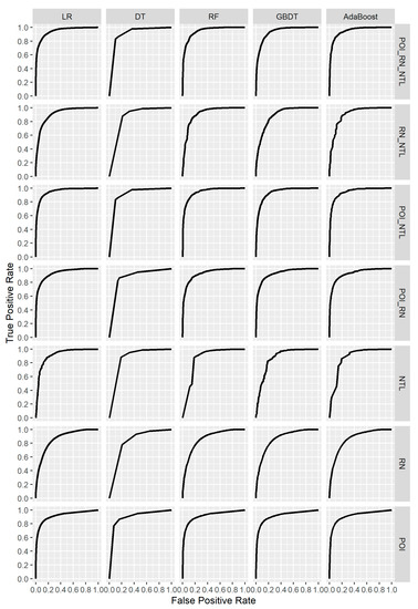 Among the 35 combinations between the five classifiers and seven types of input data, UC ranged from 0.83 to 0.95 (Figure 10). Overall, the largest AUC was obtained using POI_RN_NTL and POI_NTL data against AdaBoost, LR, and RF, while the smallest AUC was obtained using the RN data and DT. The ROC curves for the 35 combinations are shown in Figure 11.