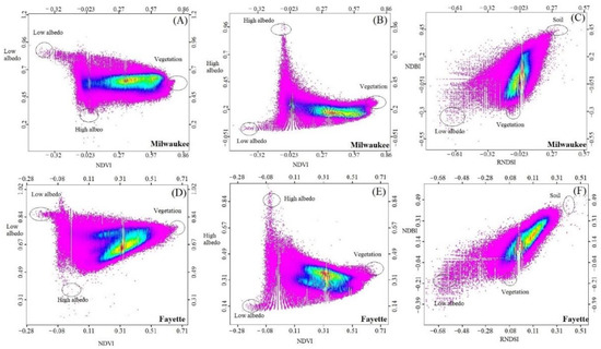 Figure 3. Two-dimensional feature space plots generated from spectral indices for both Milwaukee County: (A) NDVI-Low albedo (B) NDVI-High albedo (C): RNDSI-NDBI and Fayette County: (D) NDVI-Low albedo (E) NDVI-High albedo (F) RNDSI-NDBI.
