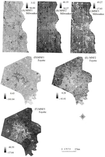 Figure 4. Minimum noise fraction (MNF) images derived for Milwaukee County: (A) MNF1 (B) MNF2 (C) MNF3 and Fayette County: (D) MNF1 (E) MNF2 (F) MNF3.