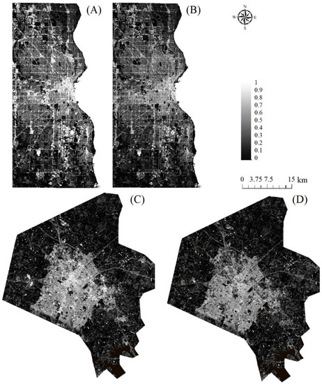 With the derived spectral indices images, pure endmembers were selected and applied in unmixing analysis to extract four fractional images: high albedo, low albedo, vegetation, and soil. In most studies, the impervious surface was considered as the combination of high albedo and low albedo. Therefore, in this study, the fractional impervious surface map was generated by combining the quantified high albedo and low albedo images (Figure 6). Figure 6A,C illustrate that the spatial distributions of the quantified impervious surface fractions are consistent with the known land use/land cover pattern of Milwaukee County and Fayette County. For Milwaukee County, high abundances of impervious surfaces (AIS > 70%) are majorly distributed in the most urbanized and populated areas, such as the City of Milwaukee (the largest city in Milwaukee County). Medium abundances of impervious surfaces (AIS: 30–70%) are located in the satellite cities around the City of Milwaukee, such as West Allis, Shorewood, and Glendale, which are commonly recognized as residential communities. Moreover, low abundances of impervious surfaces (AIS < 30%) are majorly located in the southern and northern areas of Milwaukee County, which are mostly recognized as vegetation, such as crops, forests, and grasses. For Fayette County, the high fractional impervious surfaces (AIS > 70%) are mainly located in the largest city and also the center of the County, the City of Lexington. Medium fractional impervious surfaces (AIS: 30–70%) are distributed around the City of Lexington, especially the southwestern part of the County, which is majorly covered by houses and apartments. The low fractional impervious surfaces (AIS < 30%) are distributed on the outskirts of the county, which are mostly covered by croplands.