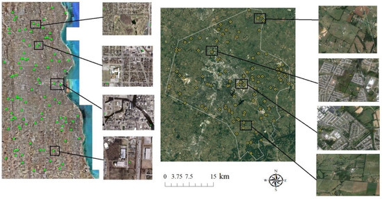 Figure 7. The sample points over the Milwaukee County and Fayette County (background images are the collected fine resolution images used as reference data).