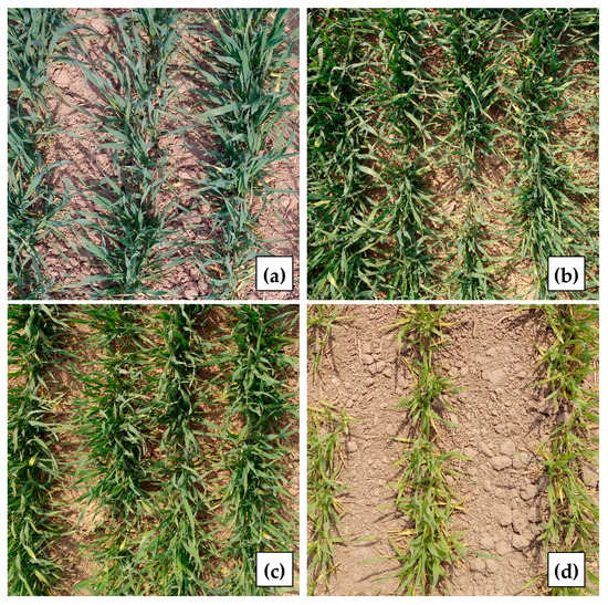 Winter wheat canopy photos. (a–d) Are from the plots with N3, N2, N1, and N0, respectively.