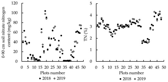 The distributions of the two parameters were consistent with the setting of the N fertilizer levels. With the increase of N fertilizer application, both parameters showed an upward trend. It is worth noting that the two parameters for the plots where P was 0 (numbered 10 to 24 in Figure 1). The content of soil nitrate nitrogen showed a rapid increase, while the TN of winter wheat in plots 16 to 24 stayed at around 3.05%. The severe shortage of P fertilizer inhibited the absorption of N fertilizer by winter wheat, and the accumulation of N fertilizer in the soil made the content of nitrate nitrogen of these plots significantly higher than that of other plots. Therefore, the data from these P0 plots were excluded during analysis.