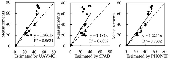 In view of the guiding role of root zone soil nitrate nitrogen content in the precise management of N fertilizer, the accuracy of the estimation models for the 0–90 cm soil nitrate nitrogen content by using the methods of UAVMC, SPAD, and PHONEP were evaluated. Figure 5 shows the linear correlations between nitrate nitrogen content in the 0–90 cm soil obtained by the laboratory testing method and that estimated by the three methods. The PHONEP method had the best estimation accuracy (R2 = 0.93 and RMSE = 9.80 mg/kg). The SPAD method had the lowest estimation accuracy (R2 = 0.61 and RMSE = 19.80 mg/kg). For the method of UAVMC, R2 is 0.86 and RMSE is 12.40 mg/kg. As shown in Figure 5, all three methods had relatively high estimation accuracy in the low-value areas of soil nitrate nitrogen content. While in the high-value areas of soil nitrate nitrogen content, the estimated values of the three methods were significantly lower than the measured values.
