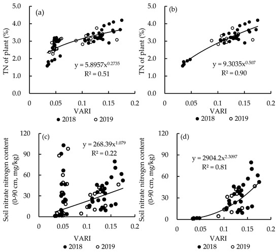 In the fertilizer level experiment, plots with P0 contained four levels of N fertilizer, N0, N1, N2, and N3. As shown in Figure 6a, the points with P0 are concentrated at the lower left of the figure. This finding indicated that even if the N fertilizer was sufficient (such as N3), the TN of winter wheat plant was still generally low. If the points with P0 were removed, the correlation between VARI and TN of winter wheat plants was significantly improved (Figure 6b). The smaller VARI was correlated with the lower nitrate nitrogen content in the soil layer of 0–90 cm as shown in Equation (13). However, in Figure 6c, there were some points with low VARI and high soil nitrate nitrogen content in the 0–90 cm soil layer. This could be attributed to the shortage of P fertilizer. When this happened, the NUE of winter wheat was reduced, leading to the retention of applied N in the soil. If these P0 points were excluded, the determination coefficient of the fitted equation for VARI and the 0–90 cm soil nitrate nitrogen content was significantly increased (Figure 6d). Results showed that the estimation method based on the canopy spectrum of winter wheat was not suitable for the estimation of N status of crops under a severe P fertilizer shortage. In actual production, the amount of P fertilizer applied was generally not too low to affect the absorption of N fertilizer by crops. Nevertheless, we should pay attention to the existence of this phenomenon.