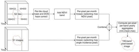 The time series of S1 and S2 images were pre-processed as shown in Figure 2. For both S1 and S2 image sets, monthly mosaics were generated, and these were then combined into a single multi-band image.