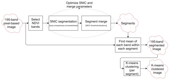 Once the optimal parameter set was chosen, the SNIC and merging algorithms were run over the entire study area, generating the segments used in the classifications (“Segments” in Figure 3). The 195-band pixel-based image was then segmented using these object boundaries, with the mean values of each of the bands per segment computed (“195-band segmented image” in Figure 3).