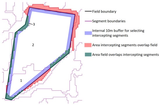 Seventy-five polygon geometries were drawn, each outlining a homogeneous field. They were selected to include a range of crop types, field shapes and field sizes. Their boundaries were defined by inspecting the very high resolution Google basemap from 2019. The average size of these fields was 3 hectares and the average perimeter was 680 m. These were used as a basis for assessing the accuracy of each of the 125 segmentation and merge parameter sets in delineating the fields accurately. An example is shown in Figure 4. The segments that intercepted the 75 geometries (internally buffered by 10 m to avoid issues with geo-location errors between S2 and basemap imagery) were selected, called the intercepting segments.