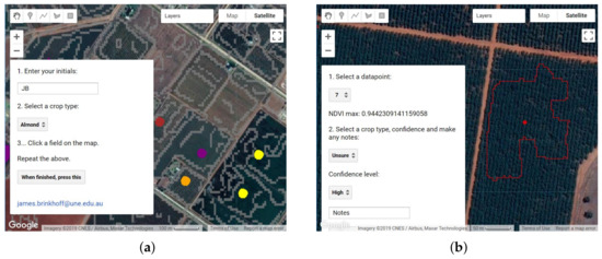 This section outlines the methods to obtain and clean the labelled training data for map classification. A GEE web application was developed, shown in Figure 5a. It displayed the segment boundaries overlaid on a high-resolution basemap. The twelve classes [Almond, Annual, Cherry, Citrus, Forest, Hazelnut, Olive, Other, Plum, Stonefruit, Vineyard, Walnut] were selectable in a drop-down menu. We enlisted the services of local area agriculture experts with detailed knowledge of crop types and locations. They entered crop types and associated locations on the map. These points were then downloaded as a GeoJSON file, with each record containing location and crop type. All of the generated training data files were merged. This yielded the “Training points” table in Figure 6 with 2005 points.