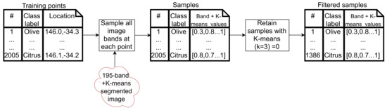 The segmented image was sampled at all of the training points. This generated another 2005 row table, with each row containing the class, location, means of all the image bands and K-means values (“Samples” in Figure 6).