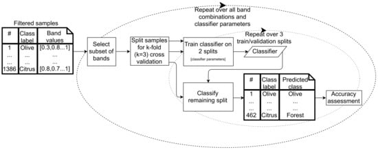 The parameters for each classification algorithm and band combination were optimized using the methodology is shown in Figure 7. The samples were split randomly into three groups. K-fold cross validation with k = 3 was then applied, training each classifier on 2/3 of the data, and validating on the remaining 1/3, repeating for the three combinations of training and validation data. The overall accuracy (correctly classified points divided by the total number of points) on the validation samples, and the mean of the overall accuracies over the three folds, were computed. The optimal classifier parameters were selected for each band combination. These classifier tuning parameters were then used while training the classifiers with the entire filtered training sample dataset. These final classifiers were then used in classified map generation.