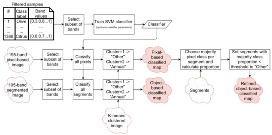Supervised classification was used to classify the remaining area of the map (belonging to K-means cluster 0), which included perennial crops and forest areas, summer annual crops and other vegetation. The SVM classifier with RBF kernel was used, as this produced higher accuracies than the other algorithms discussed above in Section 2.6.1. After the classifiers were trained on the K-means filtered samples (see Section 2.5), the classifiers were then run on the pixels or segments of the respective yearly S1 + S2 image. A number of strategies for generating the classified map were trialled, with the final map indicated by the filled red map symbols in Figure 8: