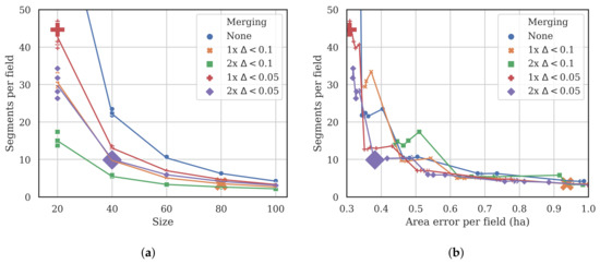 A smaller the total area error indicates more accurate field delineation. However, there is a tradeoff between the number of segments and area error. These tradeoffs were considered when selecting the optimal parameters.