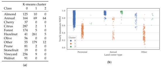 Perennial plants are those which live for more than two years [35]. They include evergreen species (such as Citrus and Olive) and deciduous varieties (such as Almond and Plum). When classifying between vegetation land cover types, the number and granularity of classes must be decided. More classes may give better homogeneity within each class, but will result in less training data per class. We settled on nine perennial crop classes, separating out those most important for the area, and for which we could gather sufficient training data. Other areas were grouped into three classes, Annual, Forest and Other. The Annual class is heterogeneous, as it included winter and summer crops. The Other class is also heterogeneous, because of the wide range of land cover types it incorporates, including vegetation, water and built structures. This within-class heterogeneity is ameliorated by the use of K-means clustering, described in following sections.