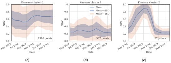 In both these cases, the NDVI is low compared to the mean NDVI of the respective class. We analyzed the maximum NDVI per class over the year, and the timing of this maximum, per class and per K-means cluster. We found that the K-means clusters with k = 3 could effectively identify these training points with very low vegetation (cluster 1). It could also identify areas used to grow an annual crop over the winter (cluster 2). These points were removed from the samples, giving the “Filtered samples” table with 1386 rows remaining, shown in Figure 6.
