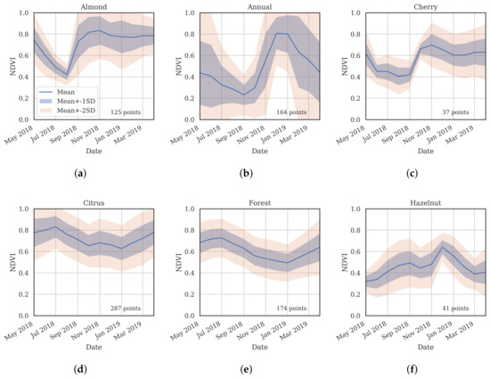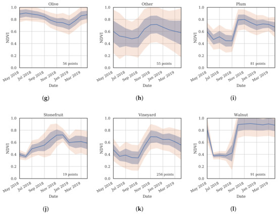 Figure 11 shows the NDVI values per month for the 12 classes, which were derived from sampling the bands of the segmented S1 + S2 image at each of the training data points within the K-means cluster 0. The mean shows the general trend of the annual NDVI variation of each class, and the ±1 and 2 standard deviations indicate the within-class variability. Some classes have quite distinct characteristics, for example Walnut with its high and constant NDVI during its green phase, and sudden drop to dormancy in June. This contributes to high classification accuracy. On the other hand, the characteristics of other classes quite similar, for example the evergreen Olive, Citrus and Forest classes. Therefore, it may be difficult for a classifier to separate these classes based on using a time series of NDVI alone. However, the final classification included the time series of all reflectance bands, as well as the Sentinel-1 radar backscatter coefficients, which provides more features to distinguish each class.