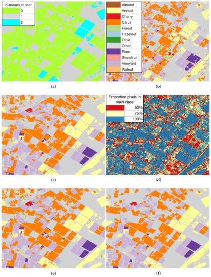 Example 33 km2 area of the classified maps. (a) K-means clustering with k = 3. (b) Object-based classified map using S1 radar time series (TS). (c) Pixel-based classification using S2(10) + S1(2) TS. (d) Proportion of pixels belonging to the majority class within each segment. (e) Refined object-based map using S2(10) + S1(2) TS features with proportion threshold of 0%. (f) Refined object-based map using S2(10) + S1(2) TS features with proportion threshold of 80%.