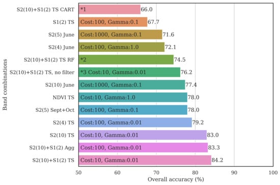 Classification accuracy using k-fold cross-validation with 3 folds was assessed on the samples with four classifier algorithms and many combinations of S1 and S2 bands (Figure 7). The most important parameters for each classifier were swept to optimize accuracy per band combination. The best overall accuracy for the CART classifier was 84.8%, while the RF classifier achieved 93.3%. The SVM classifier with RBF kernel had the highest accuracy of 97.7%, with the best combination of input features being all time series bands over the 12 months (S2(10) + S1(2) TS). The SVM classifier with RBF kernel produced higher accuracies than the other classifiers for all trialled band combinations (Table 3). Most of the following results therefore are for the SVM classifier with RBF kernel. The optimal SVM gamma and cost for each band combination were determined using cross-validation (see Section 2.6.1), and subsequently used to generate classified maps.