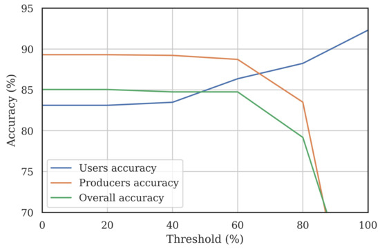 We used a procedure based on analysis of this proportion of pixels belonging to the majority class within each segment to optimize the tradeoff between producer and user accuracies [41]. A threshold was set, and a segment was assigned to the Other class if the proportion was below the threshold. A higher threshold will give greater certainty that the segment that is classified as belonging to a particular class does actually belong to that class, and thus a higher users’ accuracy, but a higher threshold will result in some segments being incorrectly classified as Other because of mixed pixels within the segment, thereby reducing the producers’ accuracy. On the other hand, a lower threshold will result in a higher producers’ accuracy, as no segments will be relegated to the Other class if there is some uncertainty, but this also gives a lower users’ accuracy, as this uncertainty due to mixed pixels will lead to segments being misclassified. Thus, a higher threshold increases users’ accuracy, but reduces producers’ accuracy and vice versa. The threshold can be chosen to balance the users and producers’ accuracies, or to optimize the most important accuracy measure for a given application.
