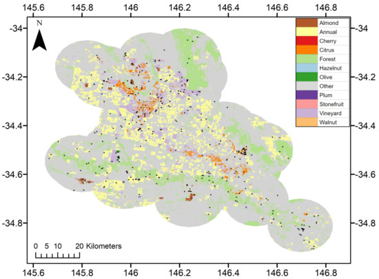 Land cover maps have applications in natural resource planning [1], prediction of environmental outcomes [2], assessment of land use change [3] and forecasting quantities of food produced [4]. Detailed mapping of crops offers a range of specific benefits for growers, industry and government. An understanding of the distribution and location of crops is essential information to enable rapid response to a biosecurity incursion, i.e., for the establishment of exclusion zones and the deployment of surveillance teams. Analysis of the location and area of crops facilitates water resource planning [5]. A better understanding of the temporal and spatial distribution of specific crop types can greatly assist in monitoring production spread and improve decision-making around varietal selection [6], harvest planning and decisions on spray application based on risk to neighboring crops and wildlife [7]. Accurate measures of a crop area are also essential when estimating annual gross production [8]. For these specific agricultural applications, land cover maps must be of a sufficient spatial resolution and updated frequently to deliver actionable information. Remote sensing offers tools to automate parts of the generation of such maps [4], and the possibility of discriminating between many crop types [9].