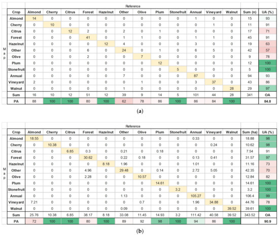 Analyzing the count-based accuracies, three out of the nine perennial crop classes had both UA and PA higher than 90%, and six of the nine had both UA and PA higher than 80%. Walnut had UA and PA close to 100% possibly because of its distinctive phenology (Figure 11l), as did Stonefruit though that class had only 5 validation segments. The classes with either UA or PA lower than 80% were Citrus (UA = 71%), Olive (UA = PA = 78%) and Hazelnut (UA = 63%). Hazelnut was concentrated in one area, and had quite low NDVI due to low canopy cover, which can be seen clearly on the high resolution base map. Forest was classified as Olive and Citrus in a number of the validation segments, probably due to their similar phenology.