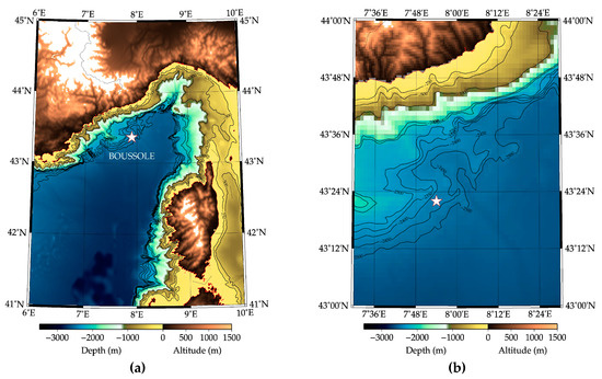 (a) The BOUSSOLE site location in the NW Mediterranean Sea (white star) including bathymetry of the area and (b) zoom on the site itself showing more details of the bathymetry.