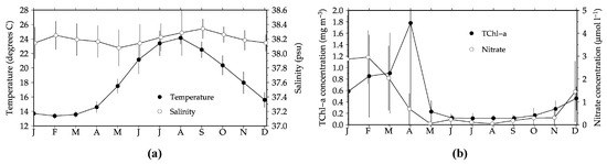 (a) Average seasonal cycles of sea-surface temperature (black symbols) and sea-surface salinity (open symbols) at BOUSSOLE (depth < 10 m), from the buoy data collected from 2003 to 2019. (b) Average seasonal cycles of sea-surface [TChl-a] (black symbols) and nitrate concentrations (open symbols). Vertical bars are standard deviations of the displayed monthly means (slightly shifted between the two parameters for clarity).