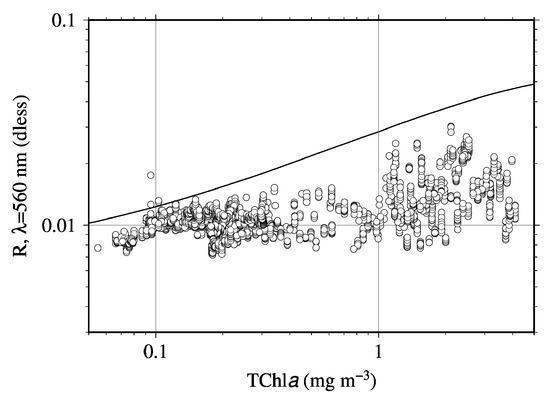 Irradiance reflectance at 560 nm, R(560), as a function of [TChl-a]. The points are from 3 years of clear-sky quality-checked buoy measurements taken within one hour of solar noon. The curve is the upper limit for Case-1 waters [32] (adapted from [28]).