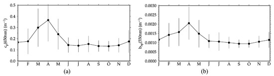(a) Average seasonal cycles at BOUSSOLE of the particulate beam attenuation coefficient at 650 nm and (b) the particulate backscattering coefficient at 550 nm, from the buoy data collected from 2003 to 2019 (depth < 10 m).