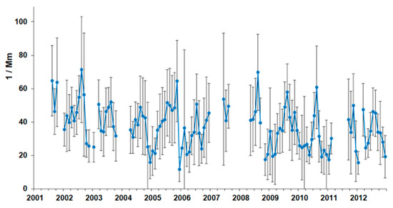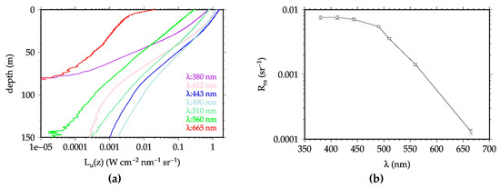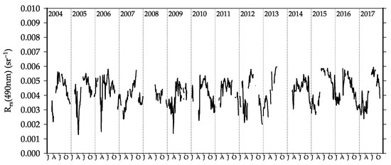Apparent optical properties (AOPs) are derived from these measurements, such as the diffuse attenuation coefficient for downward irradiance or the remote sensing reflectance [16,28]. The latter is shown in Figure 7, for λ = 443 nm, as an example illustrating the seasonal signal as well as the quasi-systematic observations through the 14 years displayed here.