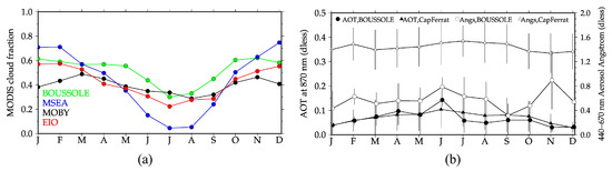 (a) Average seasonal cycles of the cloud fraction (moderate resolution imaging spectroradiometer (MODIS) product [33], average from 2012 to 2015) for the four sites indicated. The curve for the southern hemisphere Eastern Indian Ocean (EIO) site is artificially shifted by 6 months. (b) Average seasonal cycles of the aerosol optical thickness at 865 nm (black symbols) and of the aerosol Angstrom exponent (open symbols), both at the Cap Ferrat coastal AERONET station (triangles) and at the offshore BOUSSOLE site (circles).