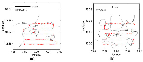 Example of grid surveys performed (a) in May and (b) in July 2019. The red dotted line shows the ship track, and the black curves are the contours of the chlorophyll-a fluorescence (values are indicated on the contour lines).