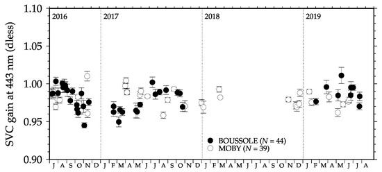 For these and any other OCR missions to deliver products of the desired accuracy, a system vicarious calibration (SVC) programme has to run over their entire lifetime [1], which is also a requirement for other types of Earth observation missions that intend to address climate change related questions [2]. Ocean colour SVC (OC-SVC) consists of adjusting the prelaunch mission spectral calibration coefficients of the onboard radiometers through comparison of the top-of-atmosphere (TOA) radiance measured by the mission, to the same quantity derived from using high-quality radiometry data collected in the field and radiative transfer computations to propagate the bottom-of-atmosphere field measurements to TOA [3]. SVC therefore requires a sustained post-launch field programme to collect the necessary data, with the aim of maintaining the level of uncertainty of the derived satellite products within predefined requirements [4,5,6,7]. This need for SVC has been demonstrated since the early times of the satellite OCR era [8]. Modern satellite OCR observations must indeed provide the water-leaving radiance in the blue part of the electromagnetic spectrum with a < 5% accuracy over meso- to oligotrophic waters [9,10], which translates as an uncertainty of about 0.002 in reflectance at 443 nm [11] when reflectance is modelled from chlorophyll following [12]. Since the marine signal is generally < 10% of the TOA radiance measured by the spaceborne sensor, achieving this goal requires that the instruments be calibrated to better than 1% uncertainty. This cannot be reached using only onboard calibration devices such as sun diffusers, hence the need for OC-SVC. It is worth remembering that OC-SVC is not an absolute calibration of the sensor. It is an adjustment of the overall response of the sensor plus the atmospheric correction algorithm [1,8]. The goal is to absorb residual uncertainties in order to obtain final products, e.g., the normalized water-leaving reflectance or radiance with the desired accuracy.