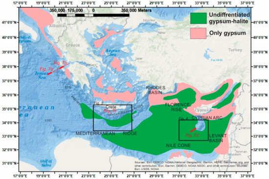 - Bertoni, C.; Cartwright, J.A. Controls on the basinwide architecture of late Miocene (Messinian) evaporites on the Levant margin (Eastern Mediterranean). Sediment. Geol. 2006, 188, 93–114. [Google Scholar] [CrossRef]