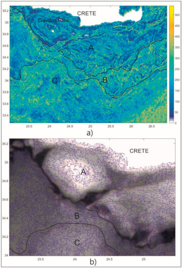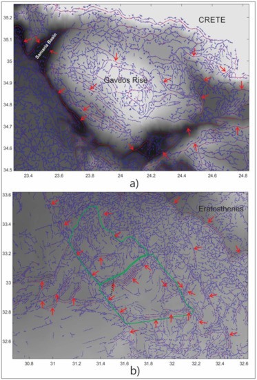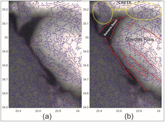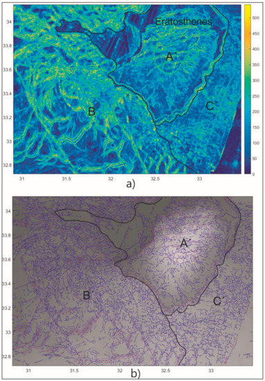 - Sub-region A’: Located on and west of the Eratosthenes Seamount characterized by (a) the presence of strong detected E–W trending, medium to long in length, and medium to sparse distributed lineaments on the Eratosthenes Seamount; and (b) very few, weak detected lineaments west of the Eratosthenes Seamount (Figure 4a,b).