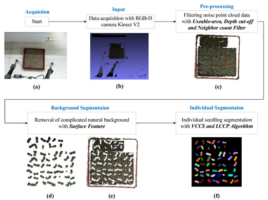 Flowchart of the proposed individual vegetable seedling segmentation scheme. (a) The Indoor Scene at Plant Factory, (b) The Original Colored Point Cloud, (c) The Pre-processed Point Cloud, (d) The Seedlings Point Cloud, (e) The natural Background Point Cloud, (f) The Segmented Individual Seedling.