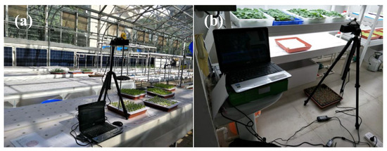 Vegetable seedling growing environments and data capturing setting: (a) experiment platform in the greenhouse; (b) experiment platform in the plant factory.