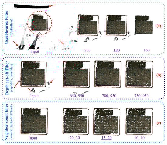First, the useable-area filter (UAF) algorithm was used to process the most useless information points for the purpose of making full use of the depth image captured by our platform synchronously and implementing our algorithm more easily. Within the UAF algorithm, useful data were extracted from the depth image. Then, the useable-area pixels of the depth image are mapped to 3D point clouds. The UafRadius was a key parameter of UAF to limit the radius of the useable area in depth images. Here, a round area with a radius of 180 pixels in depth was selected as the UafRadius to achieve satisfactory results (Figure 3a), because some valid points still existed when using a lager value (200 pixels), whereas useful points could be over-filtered if a smaller value (150 pixels) was given.