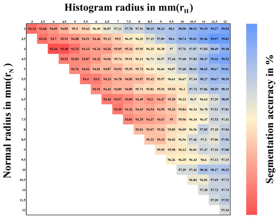 Heat map for segmentation results according to different histograms and normal radius for pre-processed point clouds with a resolution of 2 mm.
