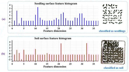 Surface feature histogram of (a) one point of cucumber seedlings and (b) one point of soil in 37-dim characteristic using = 3.5 mm and = 11.5 mm; 37-dim feature values were normalized, whose mean was zero and variance was one.