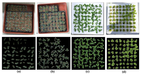 Typical example of the removal of natural background processing results from four varieties of vegetable seedlings planted in different seedling trays and growing in two types of environment: (a) cucumber (b) tomato, (c) pak choi cabbage, (d) lettuce; (a,b) soil culture, (c,d) hydroponic; (a–c) grown in plant factory, (d) grown in greenhouse. Parameters: = 3.5 mm, = 11.5 mm.