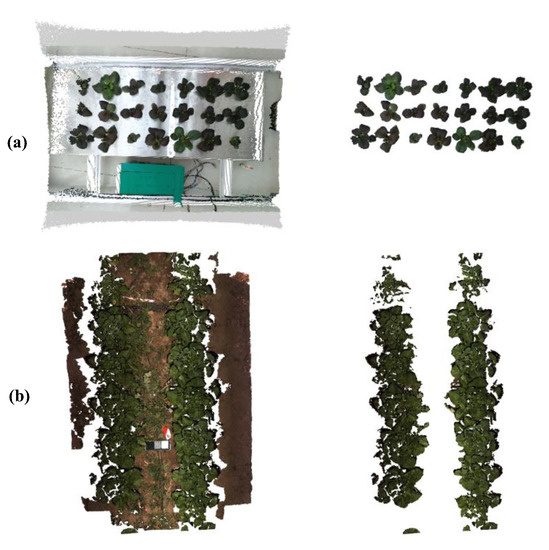 In this processing section, the pre-processed point clouds were classified into two clusters—one was seedling point clouds, the other was background point clouds. The classification results were validated using the manually segmented data. The classification accuracy was calculated using the following equation: