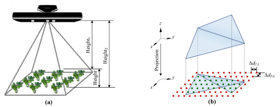 The definition and principle of system measurement method. (a) shows the definition of seedling height measurement, where Height1 and Height2 mean the distance between the Kinect sensor, seedling leaf and soil, respectively. Height is the seedling height; (b) shows the principle of seedling projected leaf measurement [31].