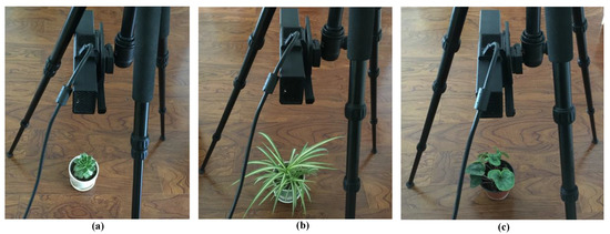To validate the plant height measurement precision of the designed system, three differently sized and shaped plants (Succulents, Chlorophytum, Cyclamen persicum) with different distances to the Kinect v2 were taken to measure the plant height parameter, as shown in Figure 14. The experimental results of Figure 14 are, in turn, shown in Table 4.