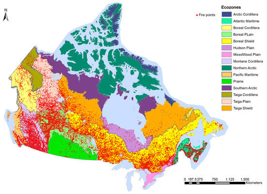Spatial distribution of all fires over a 8-year period (2010–2017), over various ecozones in Canada. The red dots indicate the fire locations. The main ecozones considered are the Boreal Shield, Boreal Plain, Atlantic Maritime, Pacific Maritime, Taiga Plain, and the Taiga Shield.