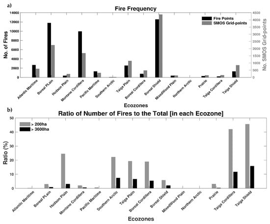 The total number of all fires, as well as the number of SMOS grid cells within each of the ecozones, is illustrated in Figure 2a. Based on Figure 1 and Figure 2a, it is clear that the majority of the fires occurred within the Boreal ecozones (i.e., Boreal plain and Boreal shield) and in the Montane cordillera. In some ecozones, such as the Boreal plain and Montane cordillera, there are few SMOS grid pixels, which implies a relatively large number of fires occurred within each SMOS grid pixel in that ecozone (see Figure 2a). Figure 2b illustrates the ratio of the number of fires exceeding a specific size (200 ha and 3600 ha) to the total number of fires in each ecozone.