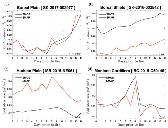SMOS (Soil Moisture and Ocean Salinity) and SMAP (Soil Moisture Active Passive) soil moisture time series over two weeks period prior to the onset of fire, for four randomly selected fires in, Boreal Plain (a), Boreal Shield (b), Hudson Plain (c), and Mountane Cordillera (d). The unique fire identifier is indicated in square brackets on the figure subtitles. r is the correlation between SMOS and SMAP soil moisture.