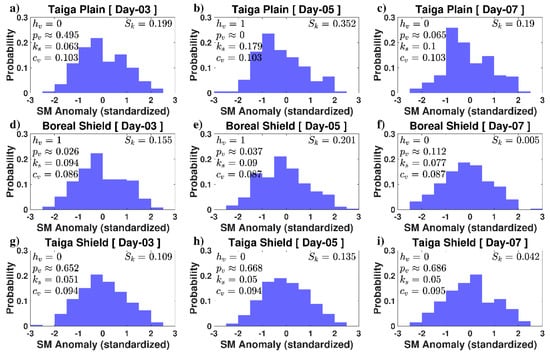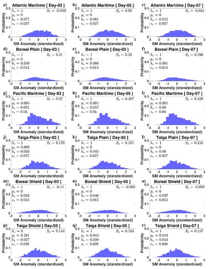 Histograms of the normalized soil moisture anomaly distribution at 3-days, 5-days, and 7-days (column-wise, left to right) prior to the occurrence of fire, for ecozones Atlantic Maritime (a–c), Boreal Plain (d–f), Pacific Maritime (g–i), Taiga Plain (j–l), Boreal Shield (m–o), and Taiga Shield (p–r), respectively. The parameters h, p, ks, and cv are MATLAB Kolmogorov-Smirnov (KS) test result parameters: ‘h’ is a logical value (0 or 1) indicating the hypothesis test result, i.e., h = 1 indicates rejection of the null hypothesis at the 5% significance level, and h = 0 indicates a failure to reject the null hypothesis. The parameter ‘p’ is the p-value of the test, ks is the test statistic and cv is the critical value of the test. If the test statistic (ks) is greater than the critical value (cv), then the KS test rejects the null-hypothesis. The parameter Sk (top right) indicates the skewness of the distribution. A positive skewness suggests a left leaning distribution, and vice versa. SM = soil moisture.